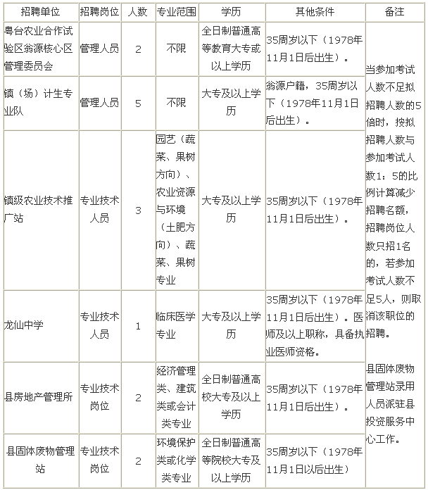 经 县编委会批准我县粤台农业合作试验区翁源核心区管理委员会、镇(场)计划生育专业服务队、镇级农业技术推广站、龙仙中学、县房地产管理所、县固体废物管理站6个事业单位面向社会公开招聘工作人员15名。根据《广东省事业单位公开招聘人员办法》(粤府令第139号),按照公开、平等、竞争、择优的原则,现就 有关公开招聘工作人员事项公告如下: