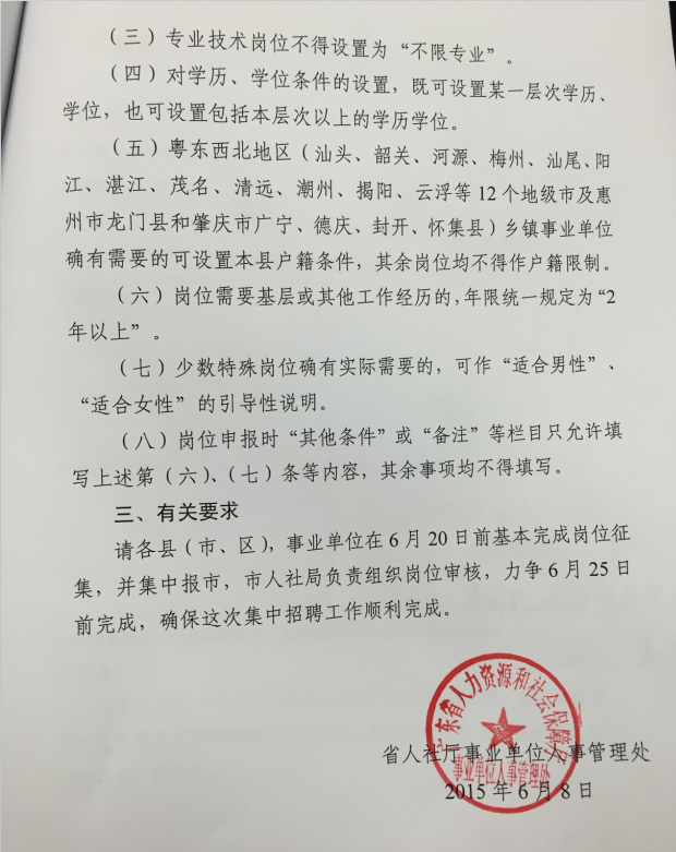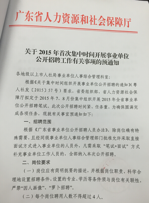 广东省关于2015年首次集中时间开展事业单位公开招聘工作有关事项的预通知