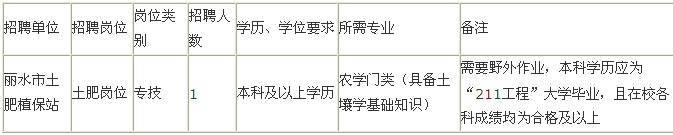 因工作需要,根据《浙江省事业单位公开招聘暂行办法》规定及《市直事业单位面向全日制普通高校硕士毕业研究生和“211工程”大学本科毕业生招聘人员工作意见》(丽人社〔2011〕13号)精神,丽水市农业局决定面向社会公开招聘下属事业单位(丽水市土肥植保站)专业技术工作人员1名,具体事项公告如下: