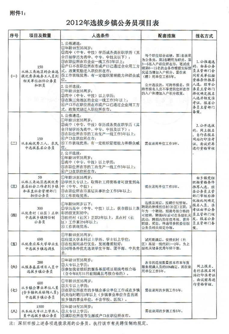 (八)从本地大专以上学历人员中选拔乡镇公务员1500名。职位主要集中在粤东、 粤西和粤北地区,按平均每个乡镇1—2名确定计划,由各市按需申报。以县为单位 、按乡镇驻地相对邻近的原则打包职位组,每组一般3个职位左右。